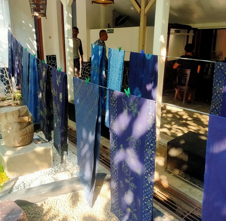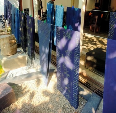 Selama dua hari, peserta tidak hanya diajarkan teori ekstraksi warna biru dari daun Indigofera, tetapi juga praktik langsung dari menakar air secara kelompok untuk membuat larutan campuran awal pewarnaan, merebus, memilih membuat pola pada kain dengan teknik shibori (jumputan) atau cap batik, melakukan pencelupan berulang kali beserta penjemurannya. Hasilnya adalah sejumlah karya kain dengan motif unik dengan nuansa biru alami yang memukau, yang boleh dibawa pulang oleh masing-masing peserta sebagai bukti nyata bahwa warna alami tidak kalah cantiknya dengan zat kimia sintetis.