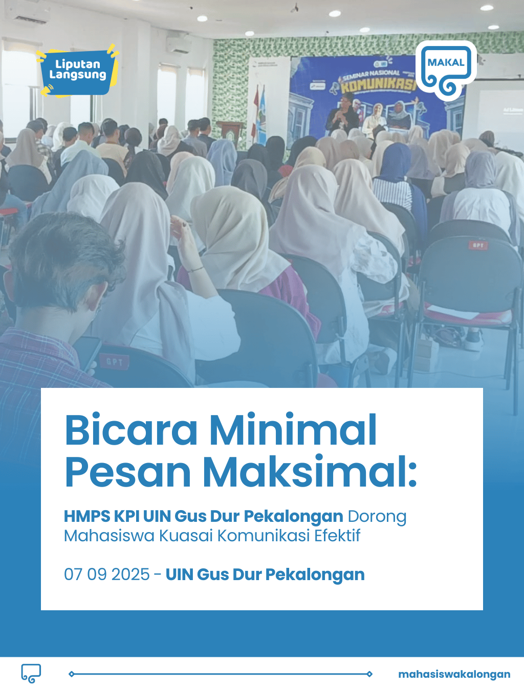 Himpunan Mahasiswa Program Studi (HMPS) Komunikasi dan Penyiaran Islam UIN K.H. Abdurahman Wahid Pekalongan menggelar kegiatan Seminar Nasional Komunikasi bertajuk "Speak with Impact: Bicara Minimal Pesan Maksimal" pada Minggu (7/9/25) bertempat di Gedung Perkuliahan Terpadu (GPT) Kampus II, UIN K.H. Abdurahman Wahid Pekalongan.